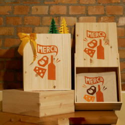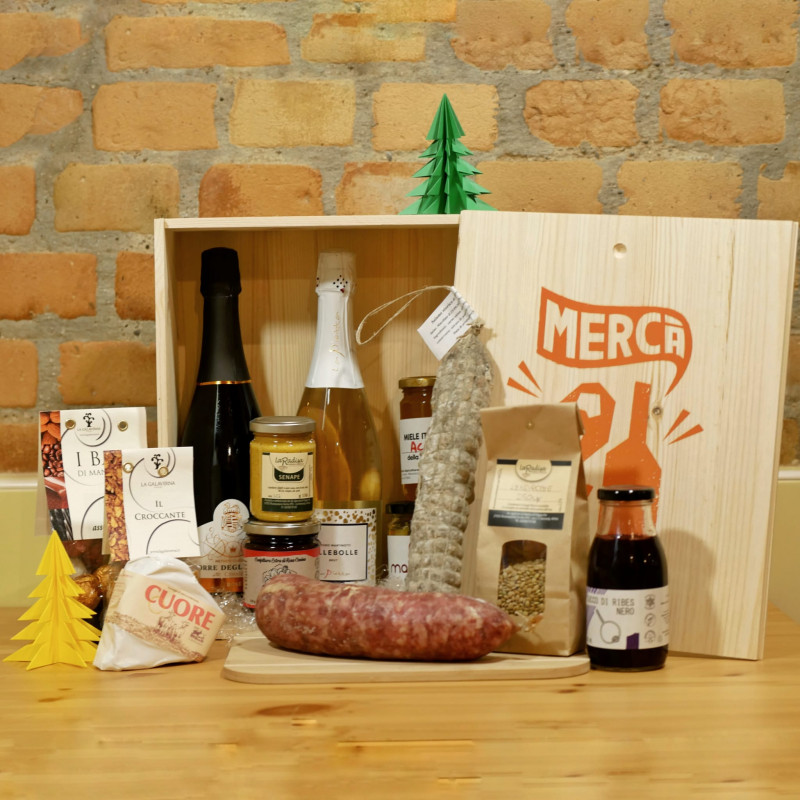 Aprire la tendina qua sotto per selezionare la confezione regalo: shopping bag Mercà in tela o scatola in legno Mercà